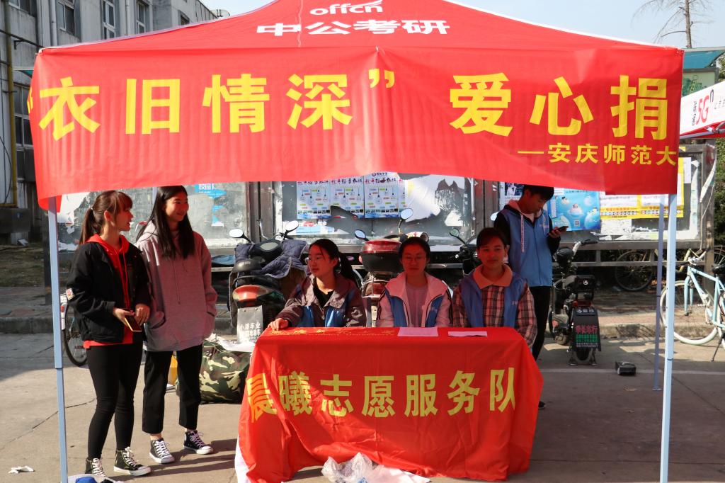 今年十一月,晨曦志愿服务队在学校三大食堂门口设点开展“衣旧情深”捐衣活动,共募捐衣物400多斤。