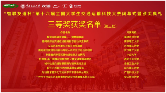 全国大学生交通科技大赛(NACTranS)是国内第一个由诸多在交通运输工程领域拥有优势地位的高校通力合作促成的大学生学科竞赛,是一个以大学生为主体参与者的全国性、学术型的交通科技创新竞赛项目。本次大赛以“共享出行,智创未来”为主题,围绕国家交通强国战略需求和交通运输行业痛点、难点问题,创新思考、创新设计、创新研究,推动大数据、互联网、云计算等智慧手段与交通运输需求深度融合。