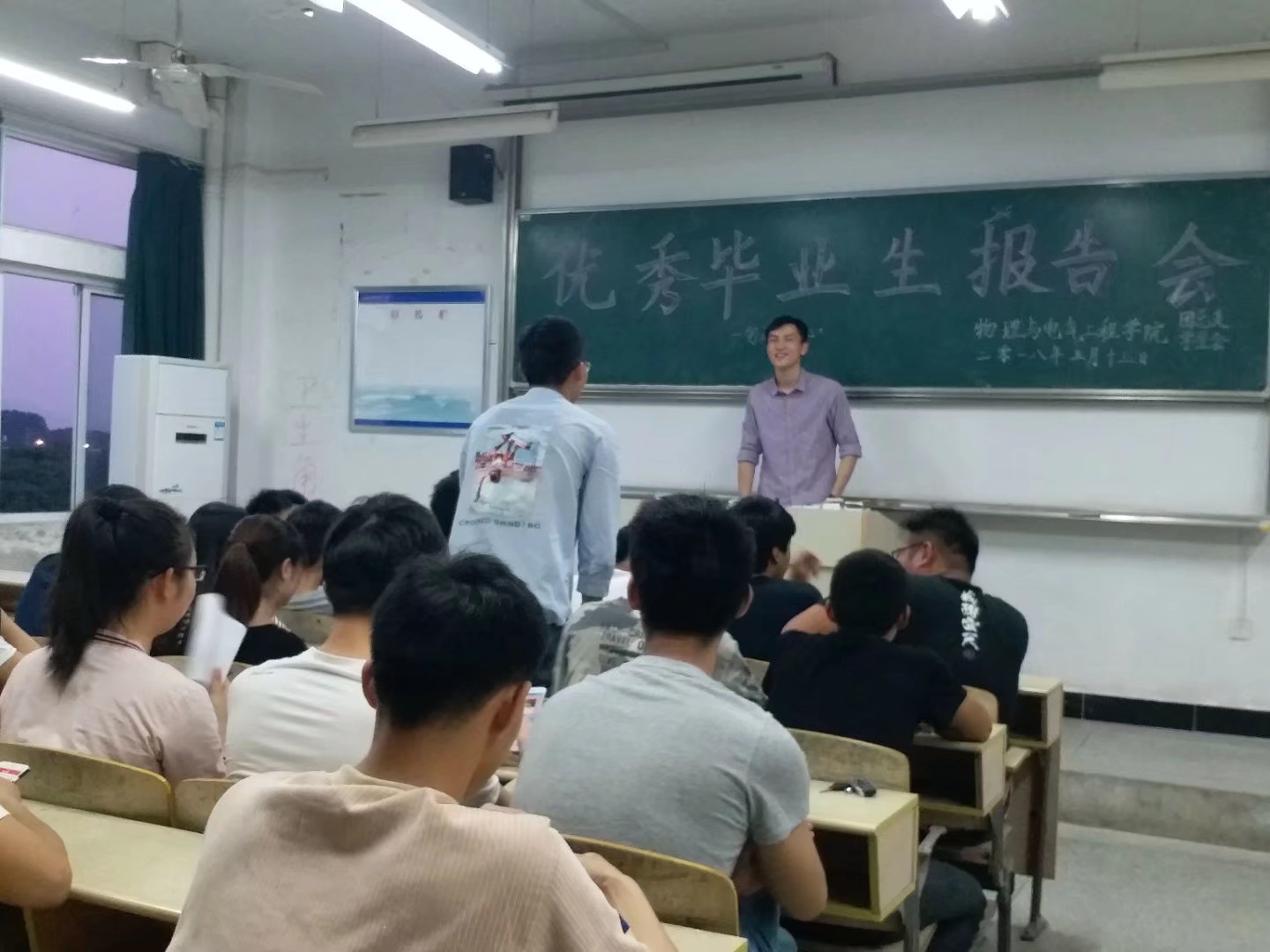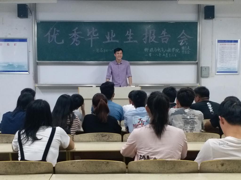 5月13日晚,我院在B楼503教室举办优秀毕业生报告会。此次报告会邀请我院优秀毕业生校“十佳青年”王和政、校“十佳青年”方志、院学生会副主席梁辉等三位优秀学子,他们从不同的方面和角度分享自己成长成才的奋斗历程和励志事迹。我院100余名学生参加了报告会。