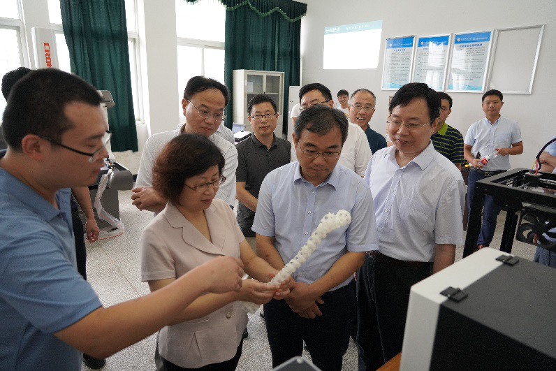 调研组一行分别考察了金工实习实训车间、工业机器人实验室和激光技术实验,并就实验室功能及应用情况与实验室相关负责进行了现场交流,在随后的座谈会上,学院党委书记江贵生教授向与会领导汇报了汽车产业学院筹建相关情况。