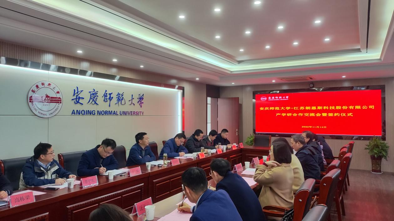 汪时珍代表学校对安庆经开区、江苏朗恩斯科技股份有限公司一行表示欢迎,并简要介绍了学校的发展历史、师资力量、发展思路等。他指出,安庆师范大学始终坚持“地方性、应用型、有特色、高水平”的办学定位,始终以服务地方经济社会发展为己任,特别是近年来,在市委市政府和学校的高位推动下,市校合作不断深入。他希望,校企双方按照“目标引领、需求导向、项目驱动、深度融合、人才共享、互利共赢”的合作思路,签订务实管用的合作协议,通过项目化运作方式,深度拓展各领域的合作,把学科优势、人才优势、创新优势转化为地方产业优势、经济优势和发展优势,携手打造产学研合作新典范。