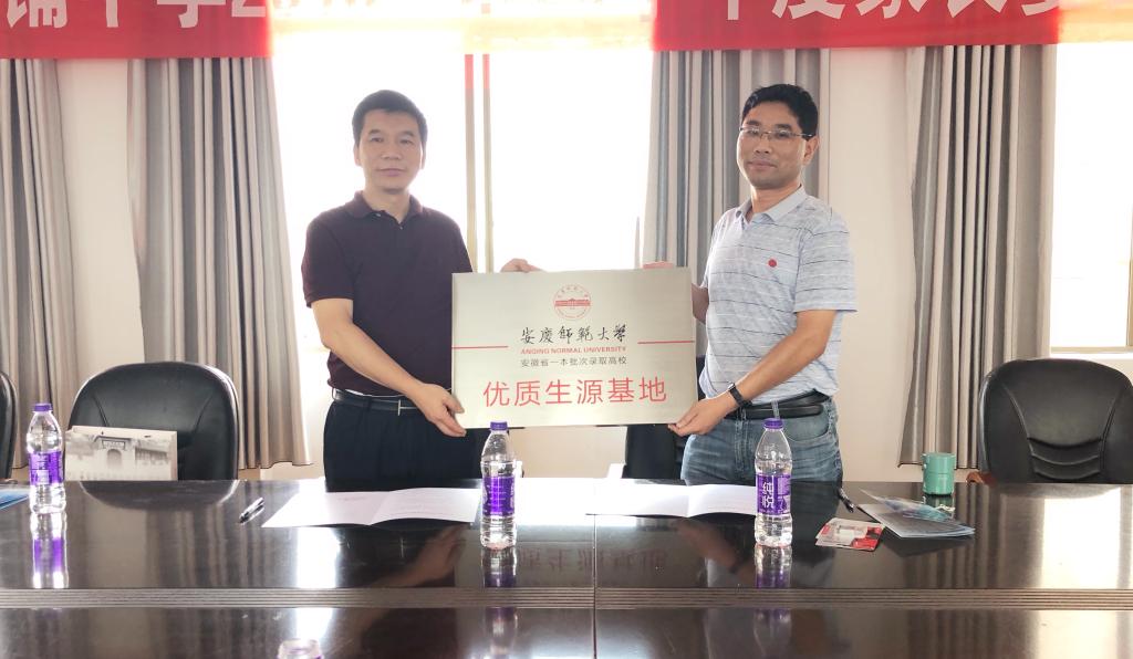 6月26日上午,招生宣传小组来到潜山市黄埔中学,与黄埔中学校长李中京、副校长程后生、教务处主任洪李男、各毕业班班主任等进行座谈并举行签约仪式。座谈会上,章礼华介绍了学校在黄埔中学招生的基本情况以及近年来学校在学科建设、人才培养等方面取得的成就,并从历年的生源质量、培养特色、就业去向等角度进行了介绍。双方就招生合作达成意向,并签订了“安庆师范大学优质生源基地”合作协议书,举行“安庆师范大学优质生源基地”挂牌仪式。