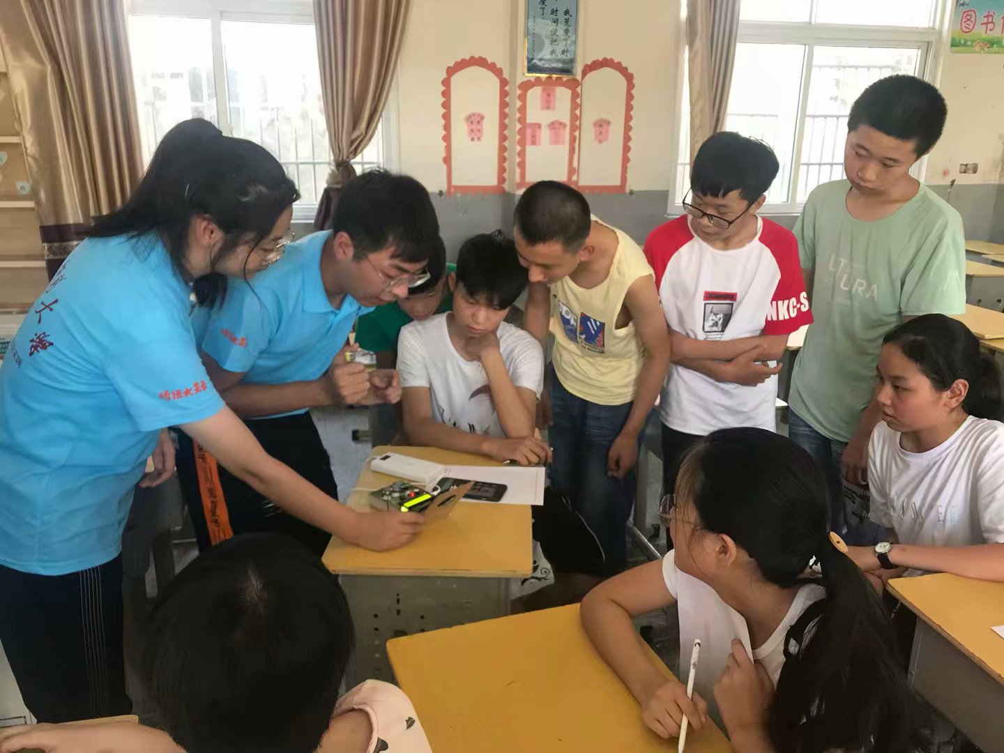 作为理工科学生,教授理科课那是必不可少的。为了让课堂不枯燥乏味,也为了能更好的帮助到孩子们,实践团成员们开展了一堂趣味数学课,让数学课堂活起来,同时在课下辅导孩子们写作业,为孩子们解疑答惑,耐心的解说着每一个问题。不仅如此,实践团成员们还为孩子们展示了自己发明的“家庭烟雾安全报警器”,极大的引起了孩子们兴趣,纷纷想要自己动手制作属于自己的小发明。紧接着,为了满足孩子们的动手愿望,实践团的成员们带领着孩子们展开了一堂手工实践课,孩子们凭借着自己聪明的头脑和我们提供的材料制作了不少小发明。发明虽小,愿望却大,在这小小的发明里,承载着孩子们满满的愿望。