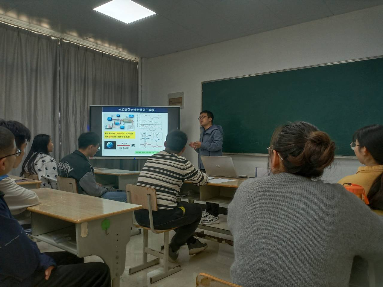 报告会上,陶雷刚博士首先介绍了激光光腔衰荡光谱技术的原理。接着,介绍了其实验室基于光腔衰荡光谱技术开展的精密吸收光谱方面研究以及近年来开发的稳频激光器和相关应用研究。最后,陶雷刚博士就现场师生提出的相关问题进行了深入的交流。