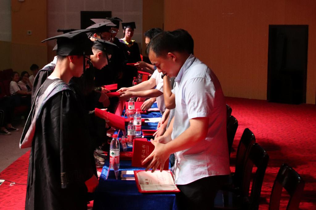 典礼最后,学院党委委员为2015级11个班的88名学生代表颁发了毕业证书,并合影留念。(陈秋生、邵琦、刘露 图/学生记者 符芳敏)