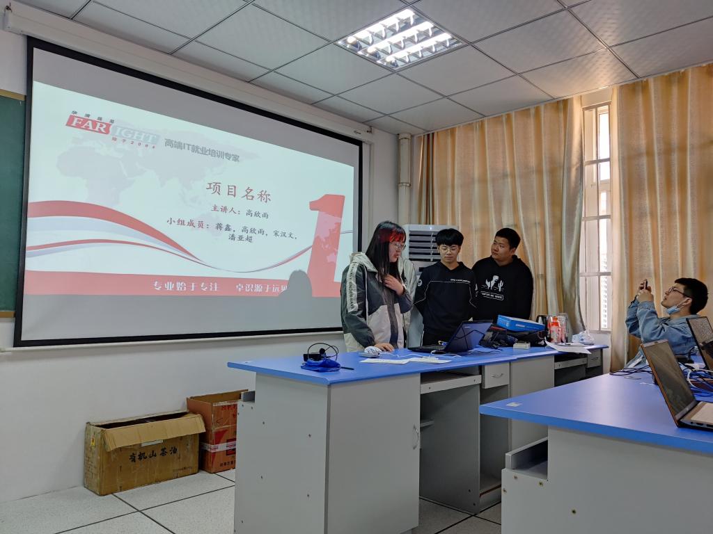 为了检验此次实训项目的培训成果,特组织了此次项目答辩环节。每个项目组专门制作答辩PPT,并上台进行演讲和展示。整个过程严格按照规范的项目答辩要求,一段段代码,一个个界面,一页页PPT,凝聚着项目成员在这段时间的努力和学习成果。通过答辩,既锻炼了他们的上台演讲能力,也是对他们学习成果的考验。