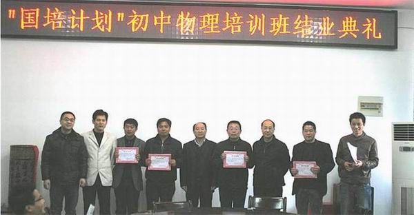 校教务处副处长黄兴帅代表学校讲话。黄处长首先带领大家学习了< <教育部关于中小学教师国培计划的意见>>。接着,他向物理与电气工程学院全体领导及老师对此次国培计划的大力支持表示感谢。他指出,这次国培计划旨在培养一批全省骨干教师,提高他们的教育教学能力,为我省的教育事业发展做出更大贡献。随后,黄处长提出三点建议:一是各位老师及学员应经常联系,互相交流工作中的教学经验,及时反馈教育教学信息;二是,各位学员及时做好培训工作的总结,提炼出优秀的论文及教学思想;三是各位学员发扬示范带头作用,及时推广优秀的教育教学方法,他还要求主办单位及时进行项目总结,做好资料存档工作。学员代表黄三发代表全体学员对物理与电气工程学院精心组织本次培训表示衷心的感谢,相信通过本次培训,学员们必将更快地提升自己,打造高效课堂。副院长江贵生要求各位学员在以后五个月的跟踪指导阶段继续完成各项任务,并在以后的工作中发挥引领示范作用。最后,副院长江巨浪宣读了各种比赛的获奖名单,各位领导与获奖学员代表合影留念。
