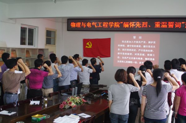 全体教工党员在领誓人、教工第一党支部书记朱永忠同志的带领下,高举右拳,面对鲜红的党旗,庄严地进行了宣誓。宣誓结束后,全体党员还观看了庆祝建党90周年电视专题片《伟大的道路》。