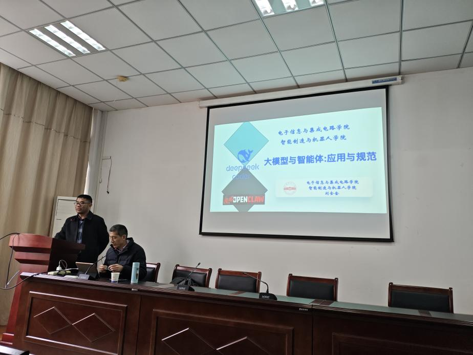 3月24日下午2时30分,由电子信息与集成电路学院和智能制造与机器人学院共同主办的学术报告在稼先楼南104学术报告厅举行。刘全金教授应邀作了题为“大模型与智能体:应用与规范”的学术报告。报告会由电子信息与集成电路学院副院长章礼华主持,两院全体研究生及相关专业教师参加。