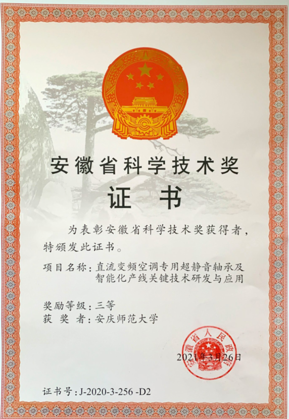 近日,安徽省科学技术奖励暨加快建设科技创新攻坚力量体系推进大会在合肥召开,会上省人民政府公布了《安徽省人民政府关于2020年度安徽省科学技术奖励的决定》(皖政〔2021〕23号)。我院联合申报的研究成果《直流变频空调专用超静音轴承及智能化产线关键技术研发与应用》喜获安徽省科技进步三等奖。